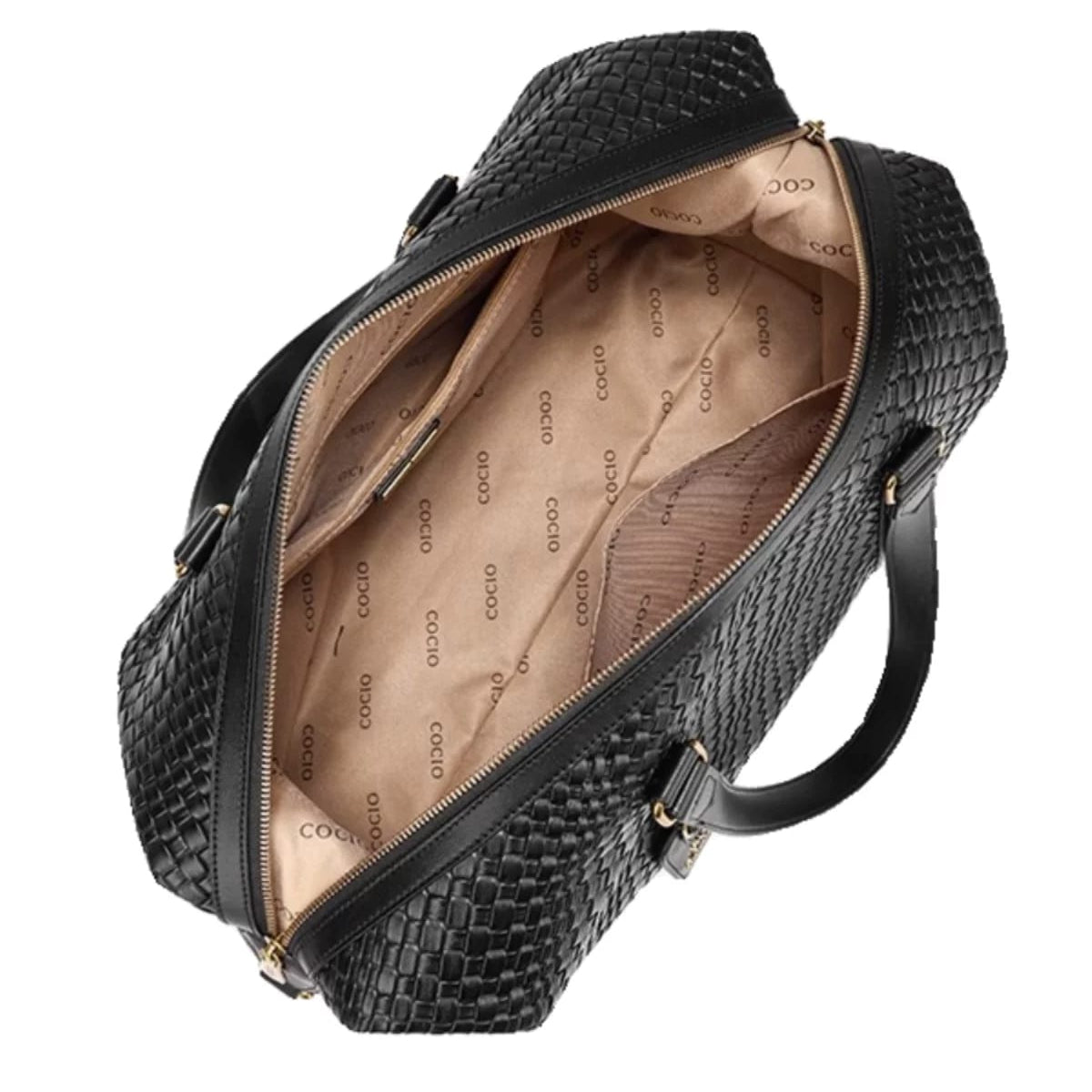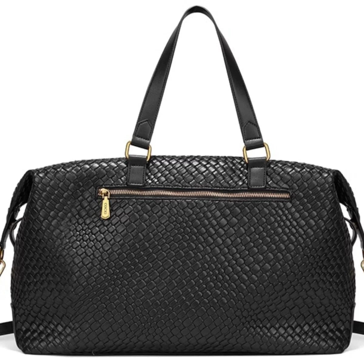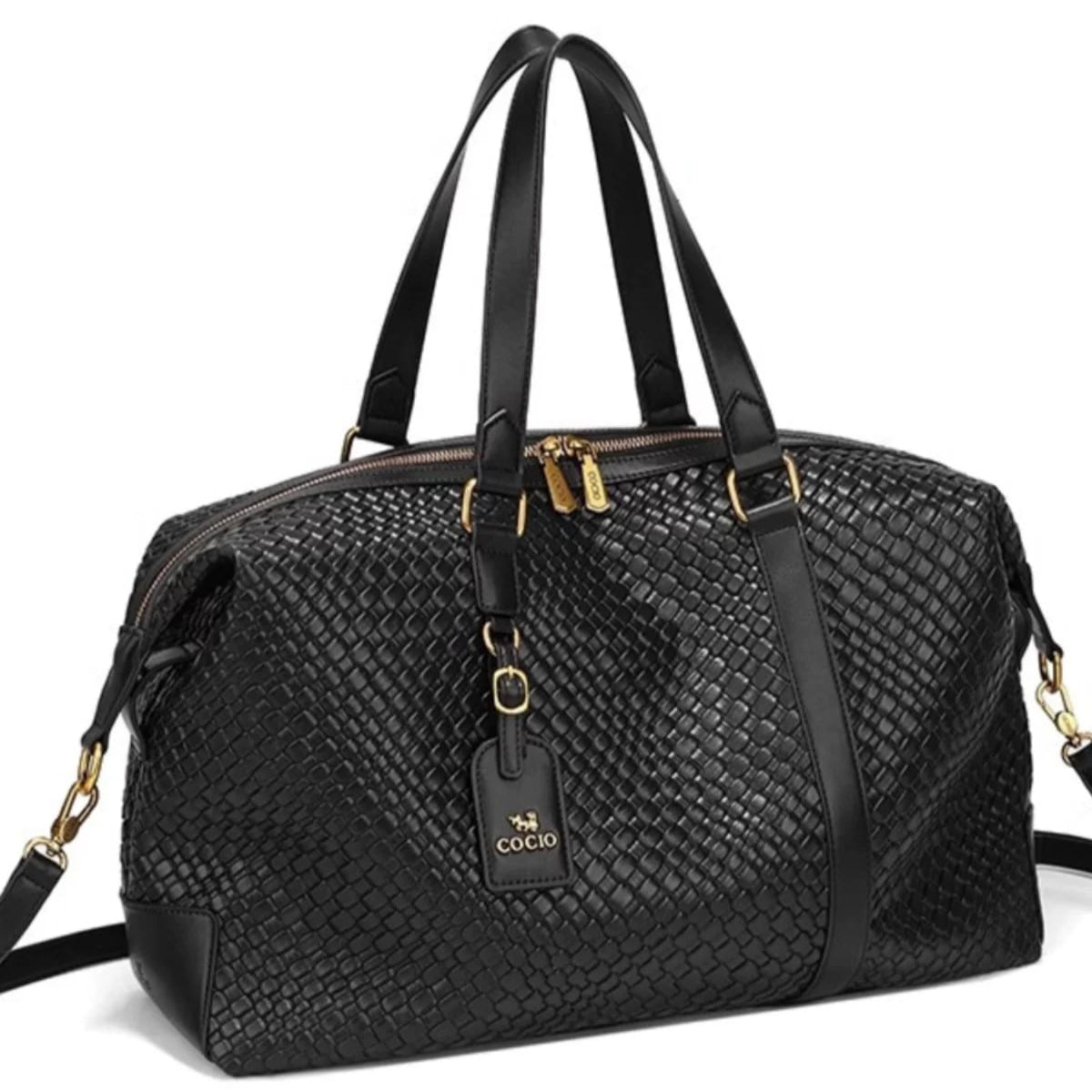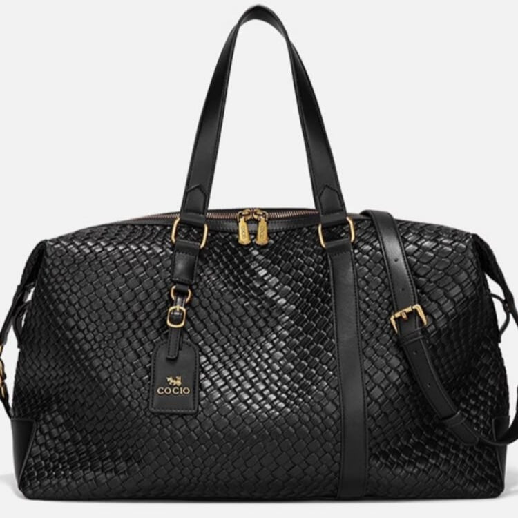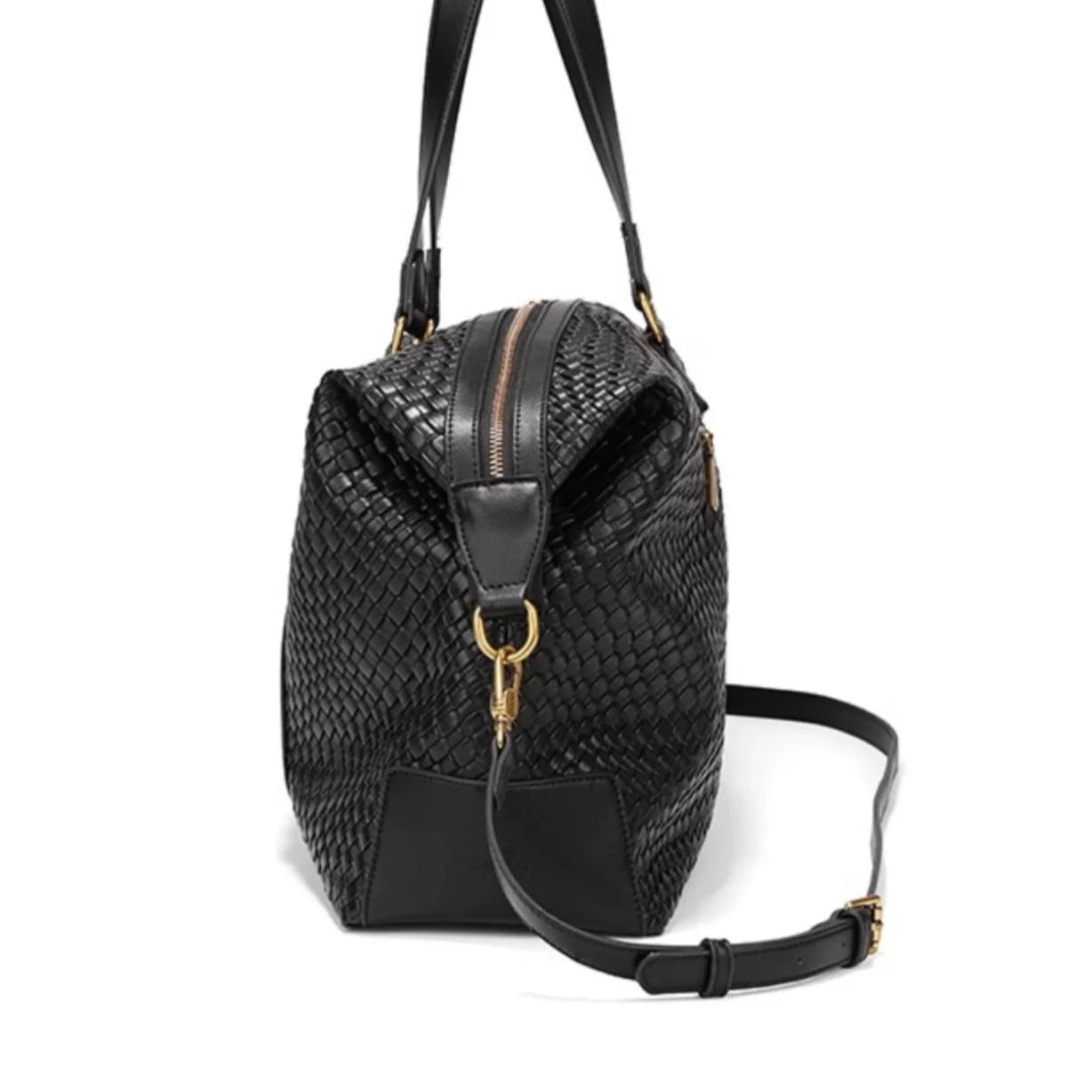 - Material: Appears to be a woven material, possibly leather or a synthetic alternative, with smooth leather accents on the handles and straps.