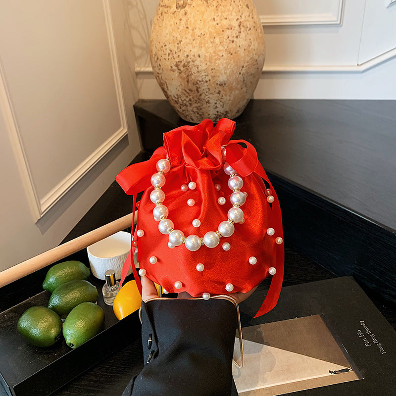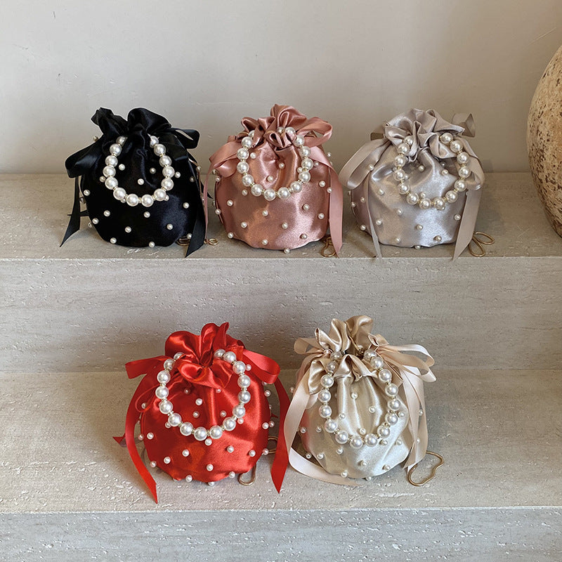 Luxury Women's Nylon Nude Color Handbag With Pearl Decoration